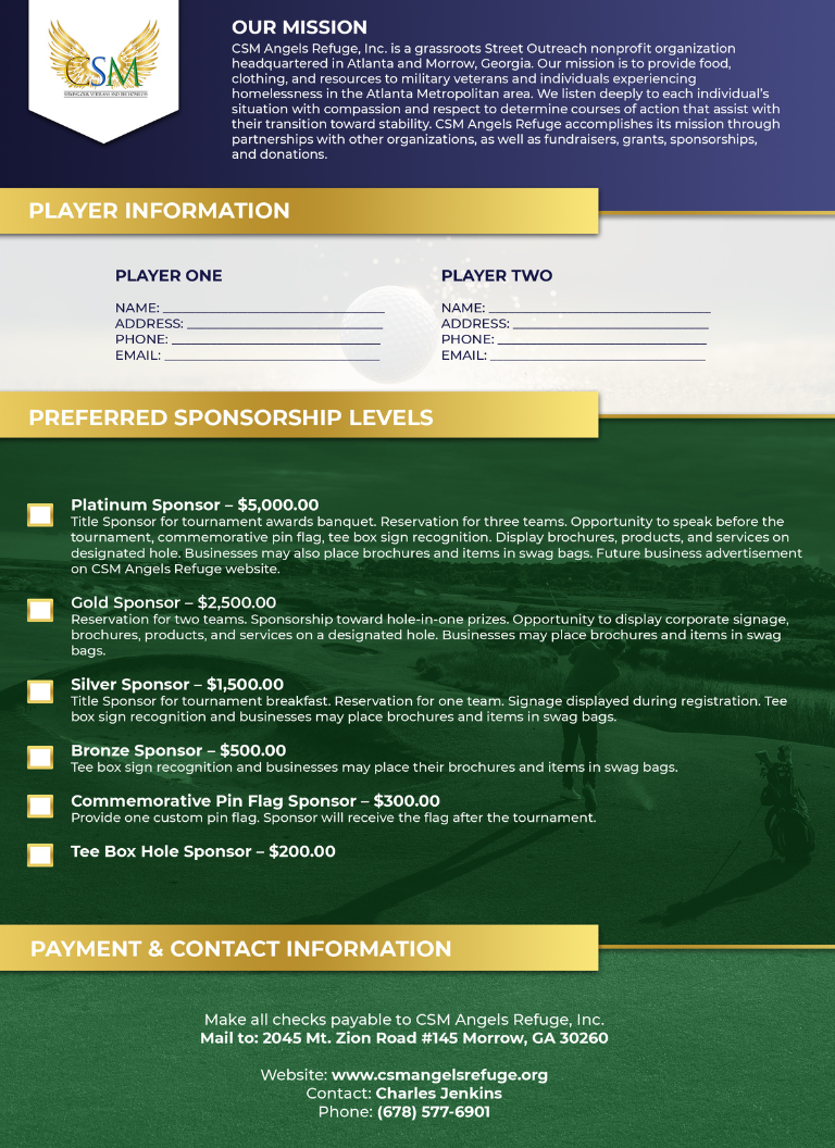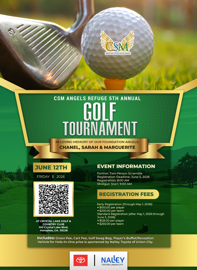 You are cordially invited to the 5th Annual CSM ANGELS REFUGE Charity Golf Classic. Join us for a day of networking and golf to support local Veterans and the Homeless. By joining us, you will be directly helping us make a difference. We offer sponsorship options at different levels that give your company strong visibility while supporting a great cause. Please RSVP or secure your sponsorship by May 20, 2026. Contact us at (470)317-4459 or csmangelsrefuge.cej@gmail.com. Thank you for your consideration and commitment to help us make a difference.